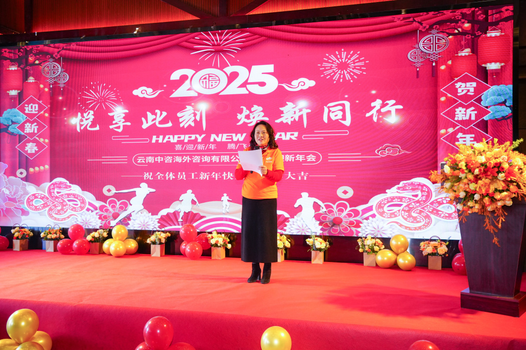 年會(huì )開(kāi)始,亢麗毓董事長(cháng)代表公司董事會(huì )向所有來(lái)賓和全體云南中咨海外的同仁及家人,表示最衷心的感謝和最誠摯的新年祝福??蝴愗苟麻L(cháng)帶領(lǐng)大家回顧2024年過(guò)往,這一年,我們從低谷中奮進(jìn),我們用堅韌超越自我,用汗水鑄就成功,用優(yōu)質(zhì)的服務(wù)贏(yíng)得了客戶(hù)的信賴(lài)和好評。